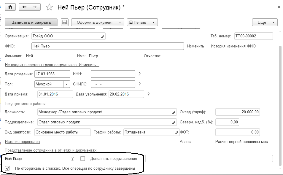 Уберем сотрудника в архив, указав соответствующий флажок в его карточке.