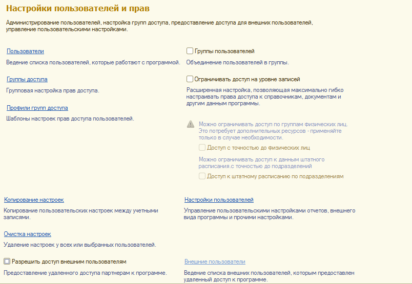 Добавление пользователей с ограниченными правами удобно осуществлять в режиме "Предприятие". В типовой поставке имеются заранее настроенные профили групп доступа, которые представляют собой совокупность ролей, определяющих функции пользователя в программе.