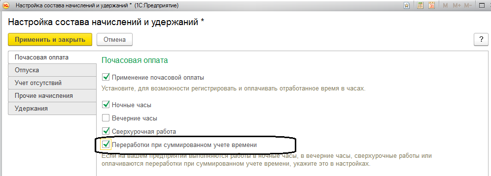 При ведении суммированного учета рабочего времени у сотрудника может возникнуть ситуация, когда он проработал больше нормы часов по производственному календарю. Такая ситуация называется переработкой. В программе существует возможность оплачивать время переработок, она включается в настройках расчета зарплаты программы (настройка состава начислений и удержаний/ почасовая оплата).