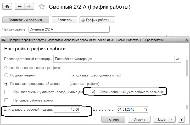 Признак суммированного учета, а также норма часов в неделю по производственному календарю устанавливается в настройках графика работы.