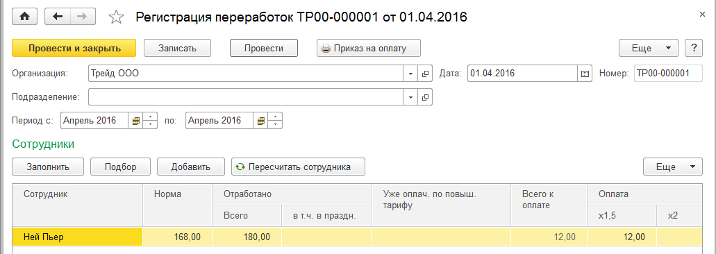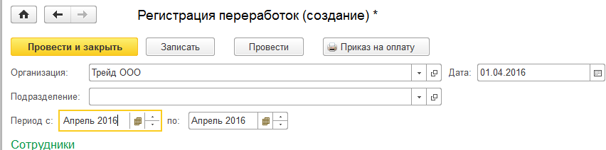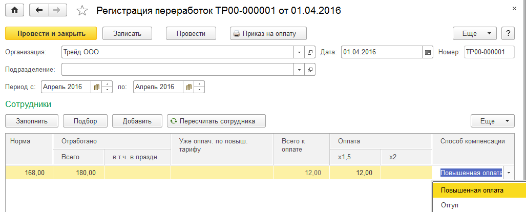Документ можно заполнить автоматически – в этом случае в документ попадут только те сотрудники, у которых программа выявила превышение фактически отработанного времени над плановым в указанном периоде. Также можно добавить сотрудников вручную. Часы нормы и факта также могут корректироваться вручную.