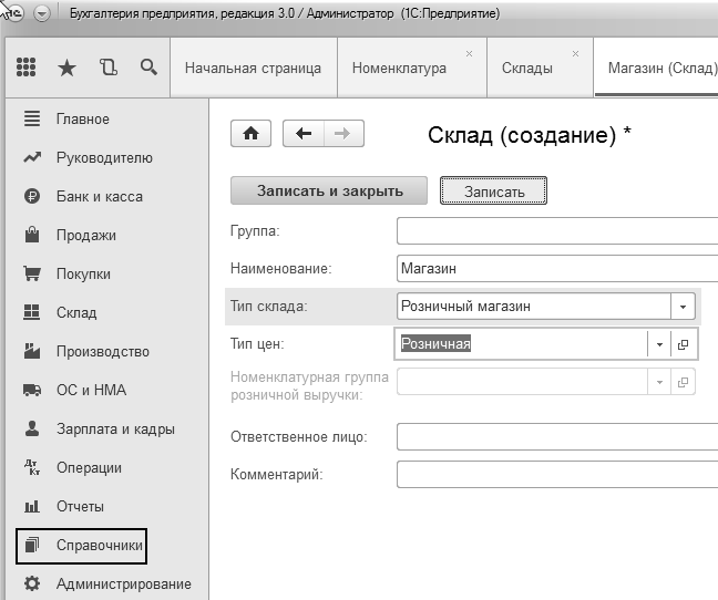 Справочник "Склады". В организации есть основной склад и магазин. Создайте склад – "Магазин".  Для магазина установите тип цен "Розничная", тип склада "Розничный магазин" (рис. 1.11.1).