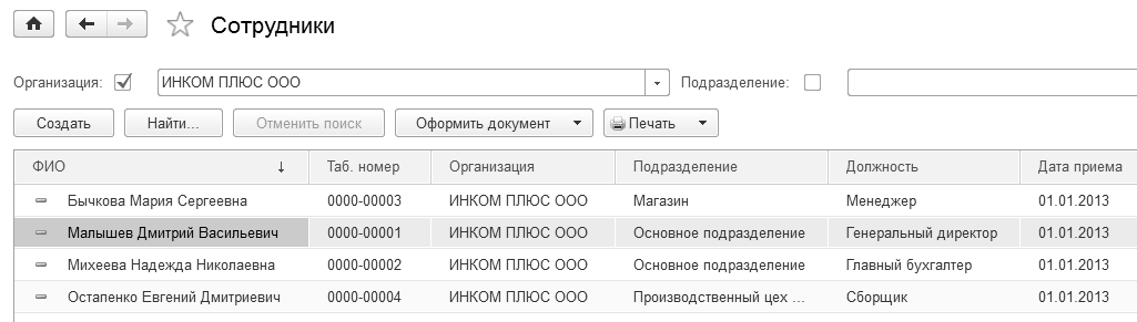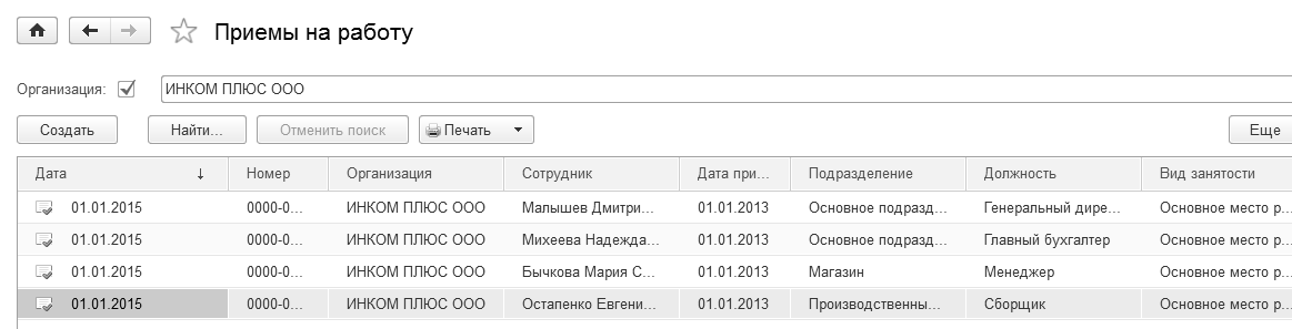 Документом "Прием на работу" регистрируется прием сотрудников на работу, размеры заработной платы работников (оклады), подразделения и должности организации, куда принимается сотрудник. Из документа можно распечатать приказ о приеме работника (унифицированная форма Т-1).