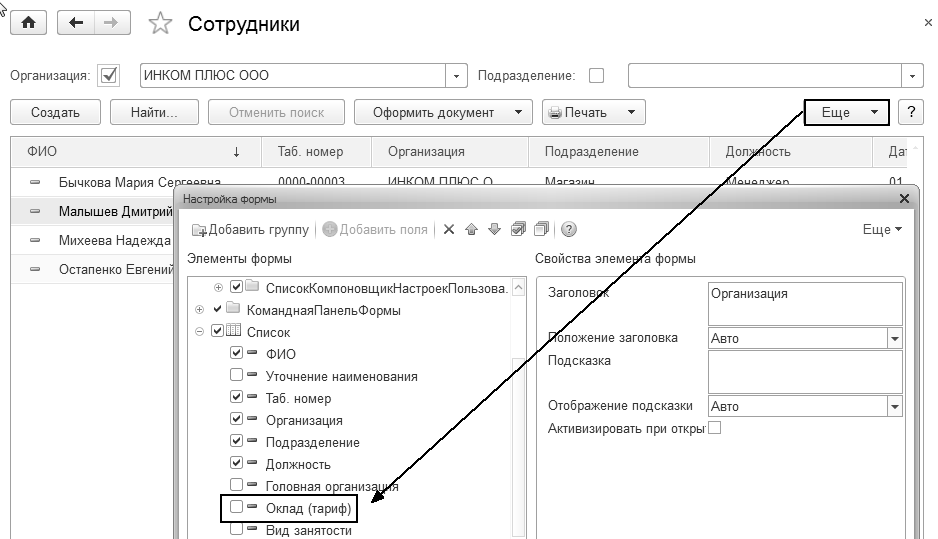 В верхней части справочника "Сотрудники" перейдите к кнопке "Еще/Изменить форму" и на левой части панели установите флаг "Оклад". Проверьте действия по рисунку 3.3.4.