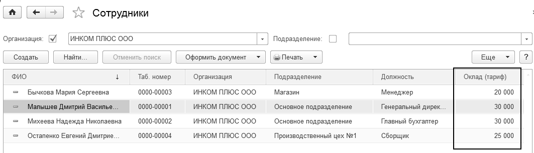Настройте форму списка работников организации "ИНКОМ ПЛЮС". Выведите графу "Оклад".