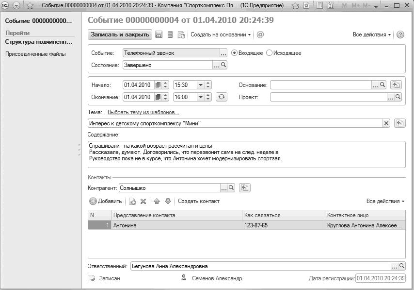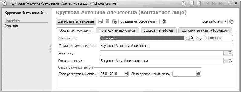 3. Контактных лиц можно выбирать из перечня контактных лиц контрагента (реквизит "Контактное лицо" табличной части), либо – ни откуда не выбирать, а просто указывать в документе ("Представление контакта", "Как связаться"). В первом случае, можно будет проследить историю взаимодействия с нашей компанией для каждого контактного лица каждого контрагента. Во втором случае такой возможности не будет. Кроме того, в списке "Контактные лица" можно хранить более подробную, чем ФИО и телефон, информацию о сотруднике клиента (Рис. 9).Вывод: сведения о сотрудниках клиентов, с которыми мы взаимодействуем (или собираемся взаимодействовать) на постоянной основе, надо вводить в список "Контактные лица".