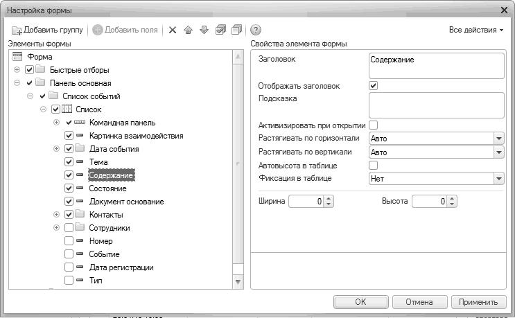 Рис. 12. В форму списка событий добавлен реквизит "Содержание"