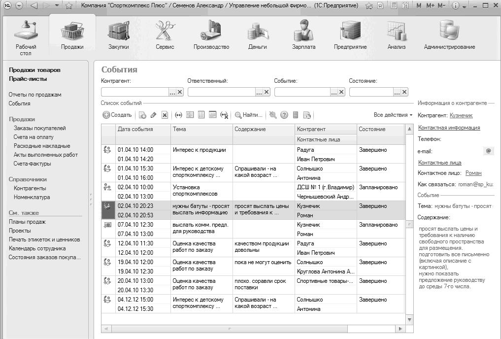 В программе "1С:Управление небольшой фирмой 8" предусмотрена возможность регистрации контактов с клиентами. При этом можно регистрировать как уже состоявшиеся контакты (звонки, встречи, переговоры, переписку), так и планируемые события контакты. Регистрация производится с помощью документа "Событие". Доступ к документам "Событие" осуществляется в разделе "Продажи".