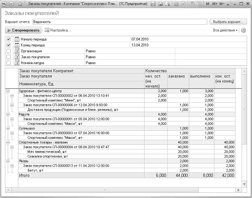 Для контроля того, все ли заказы исполнены, можно воспользоваться отчетом "Заказы покупателей", к которому мы уже обращались ранее. На Рис. 63 показан отчет "Заказы покупателей" с группировками <Заказ покупателя. Контрагент>, <Заказ покупателя>, <Номенклатура>. В показанном на Рис. 63 примере два заказа являются неисполненными (т.к. у них заполнена графа "кон.ост. (на конец)", остальные – выполнены в полном объеме.