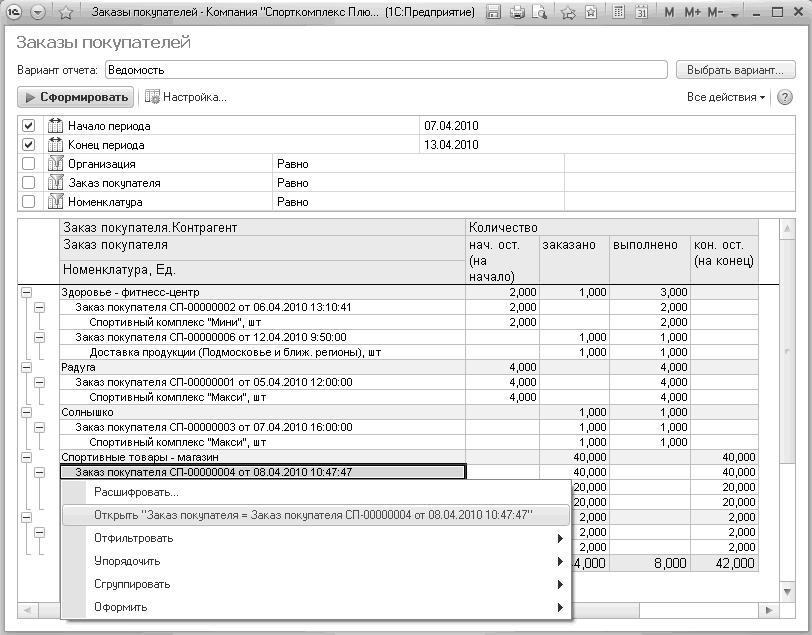 Рис. 64. Открытие заказа покупателя непосредственно из отчета