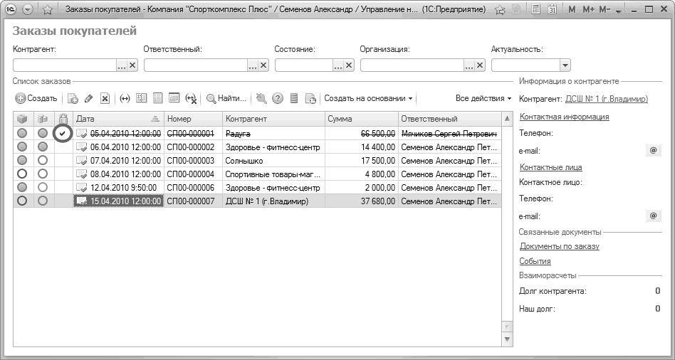 Рис. 66. Отметка о закрытии заказа в списке документов "Заказ покупателя"