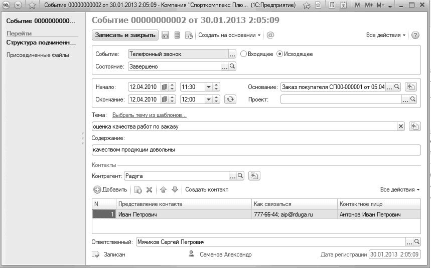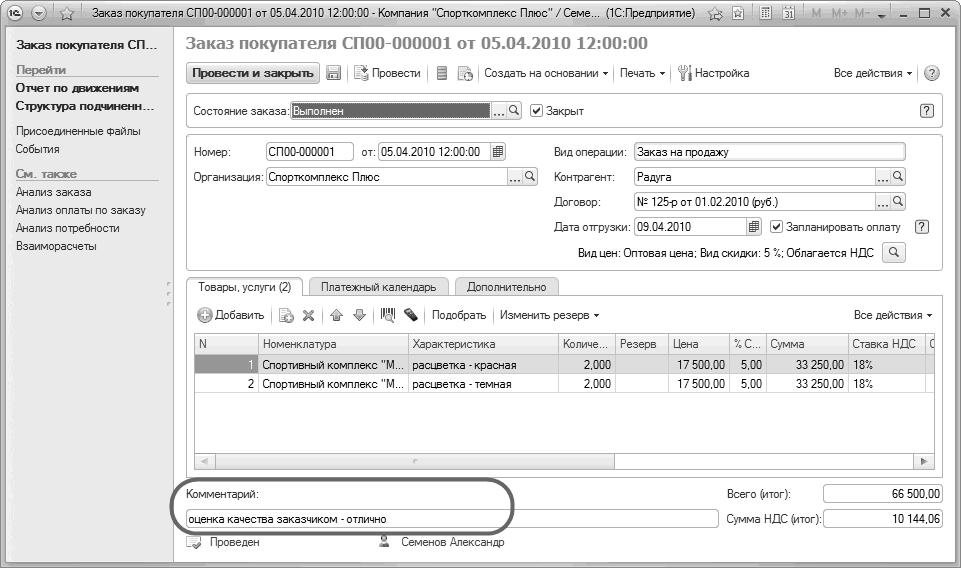 Рис. 67. Запись об оценке качества исполнения заказа клиентом