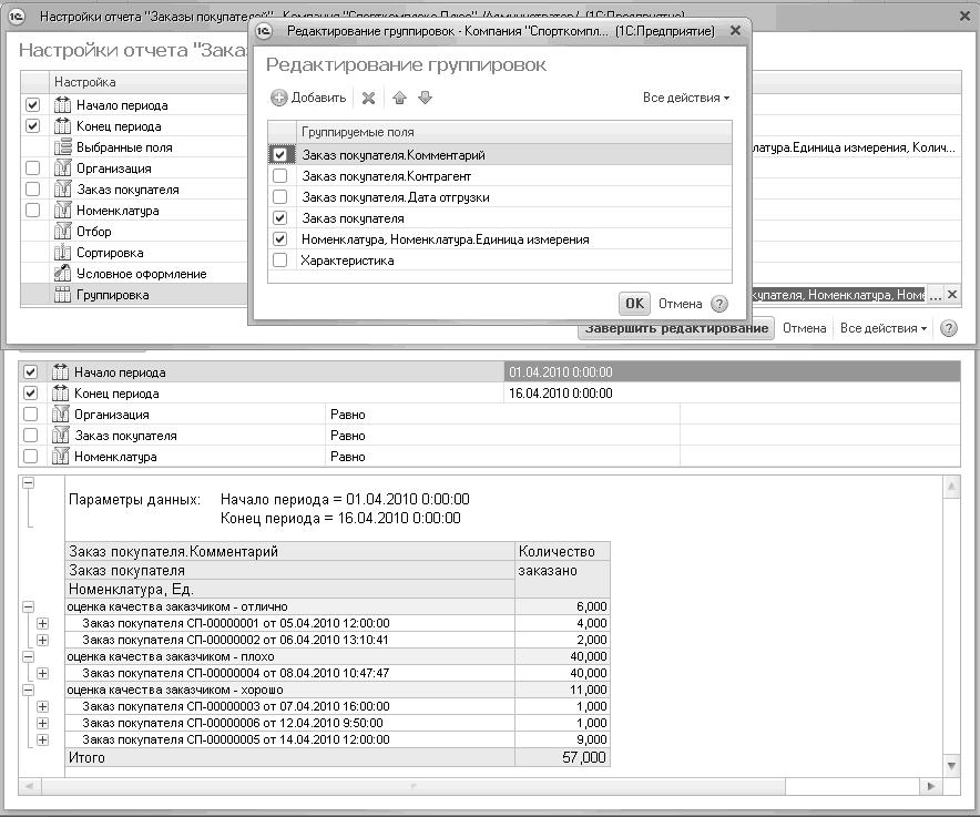 Рис. 68. Настройка группировки по реквизиту "Комментарий" в отчете "Заказы покупателей",