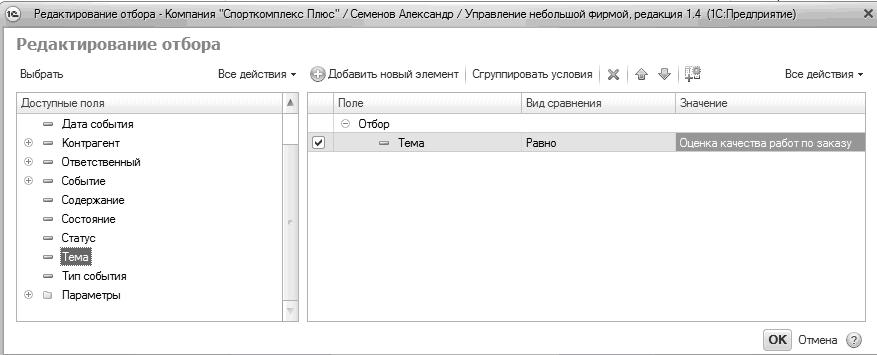 Рис. 70. Установка отбора в списке документов "Событие"