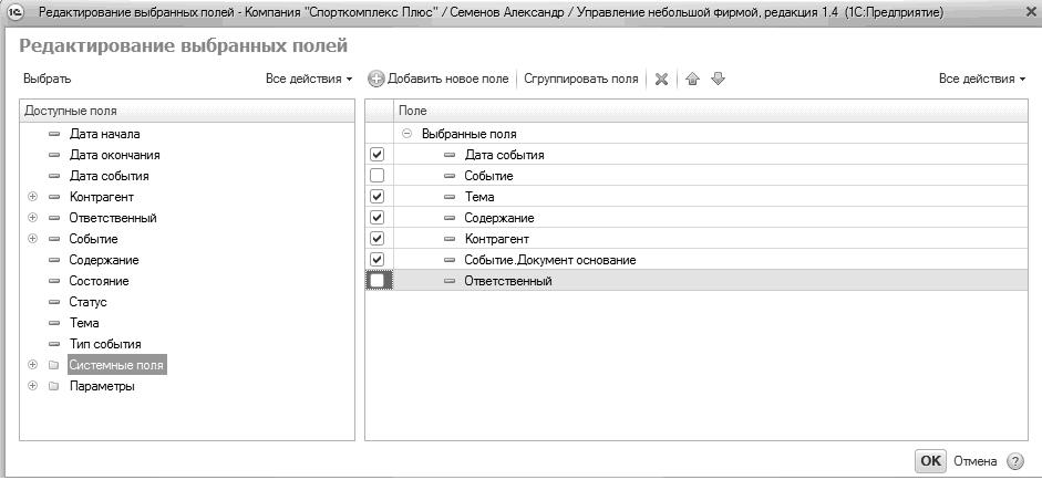 Во-вторых, включаем в состав колонок отчета "Календарь событий" те реквизиты, которые нам нужно видеть. В данном случае – это "Содержание" и заказ, по которому проводилась оценка. Выбираем меню "Настройка/ Выбранные поля", далее отмечаем галочками нужные реквизиты, определяем порядок их следования, см. Рис. 71.