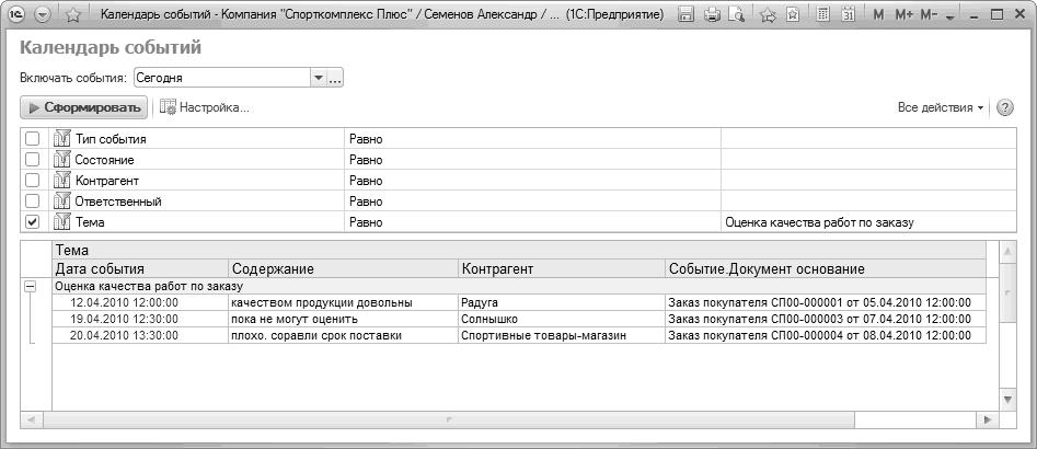 Теперь необходимо провести анализ выполненных опросов клиентов. Для этого воспользуемся отчетом "Календарь событий", который находится в разделе "Продажи"