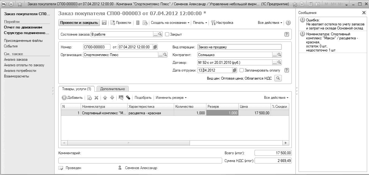 Рис. 28. Попытка резервирования продукции на складе под заказ покупателя