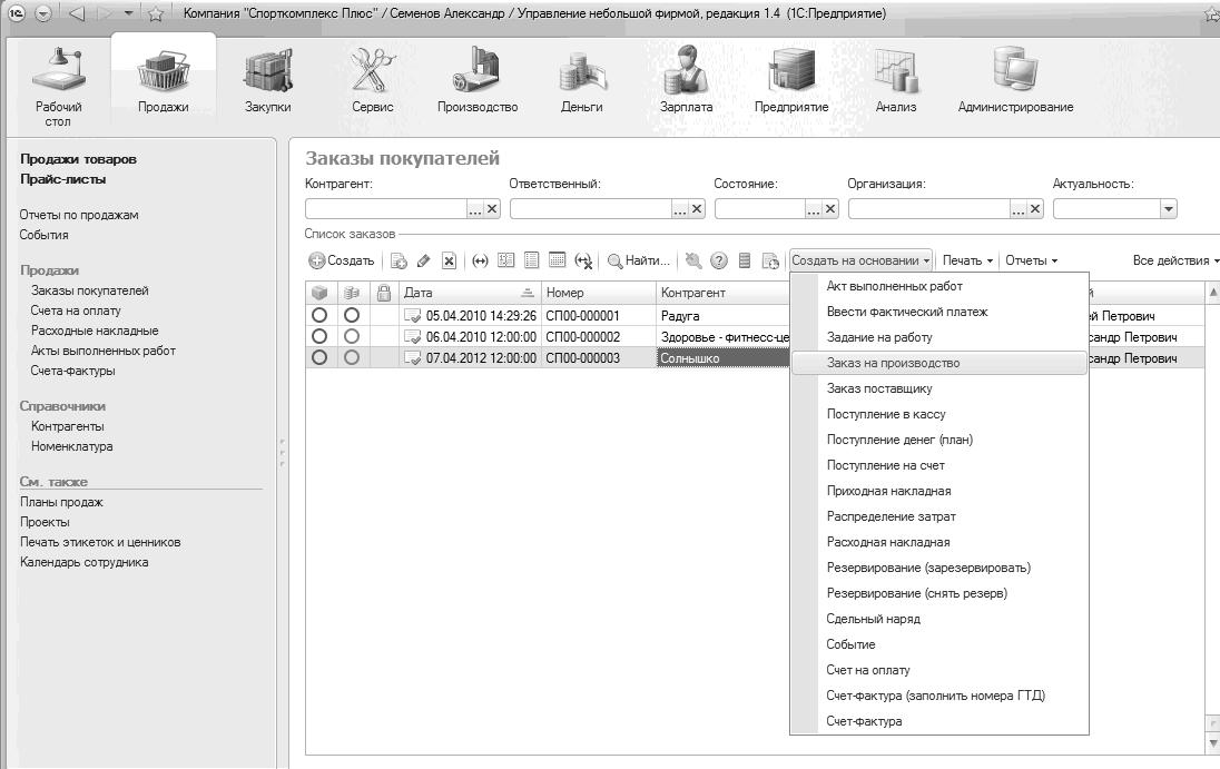 Итак, цепочка обслуживания покупателя продукции от регистрации потребности до момента отгрузки выглядит в программе "1С:Управление небольшой фирмой 8" следующим образом.