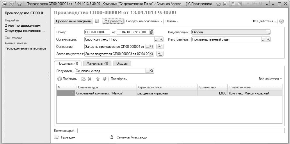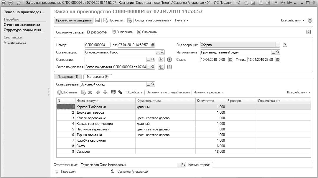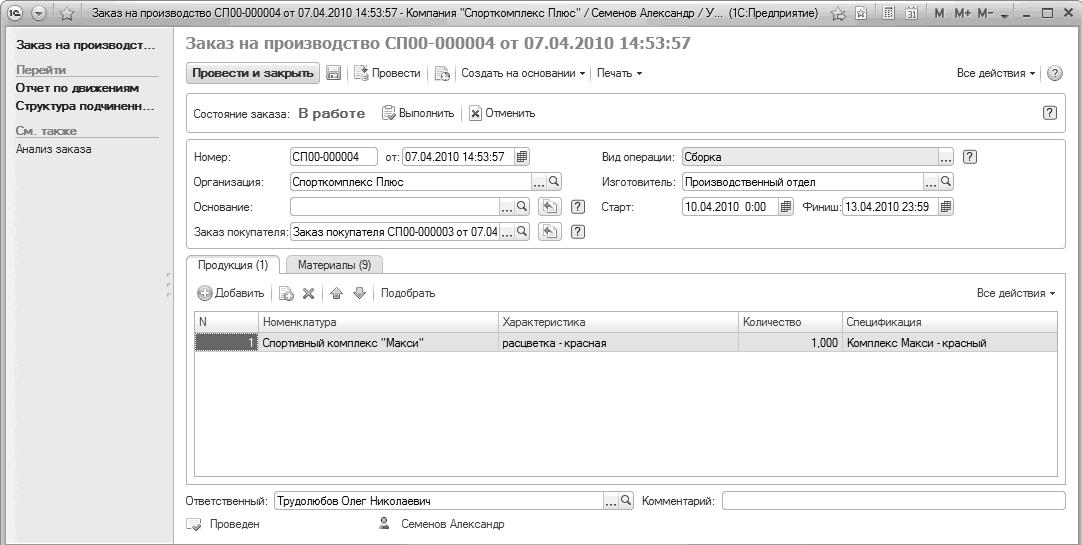 3) В целях обеспечения потребности по заказу покупателя "Солнышко" в производственный отдел 8 числа был передан заказ на производство 1 шт. спорткомплекса "Макси" красного цвета. Ответственным за производство назначен Трудолюбов.