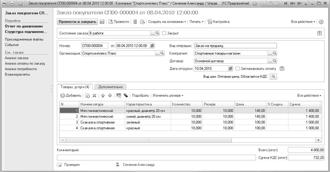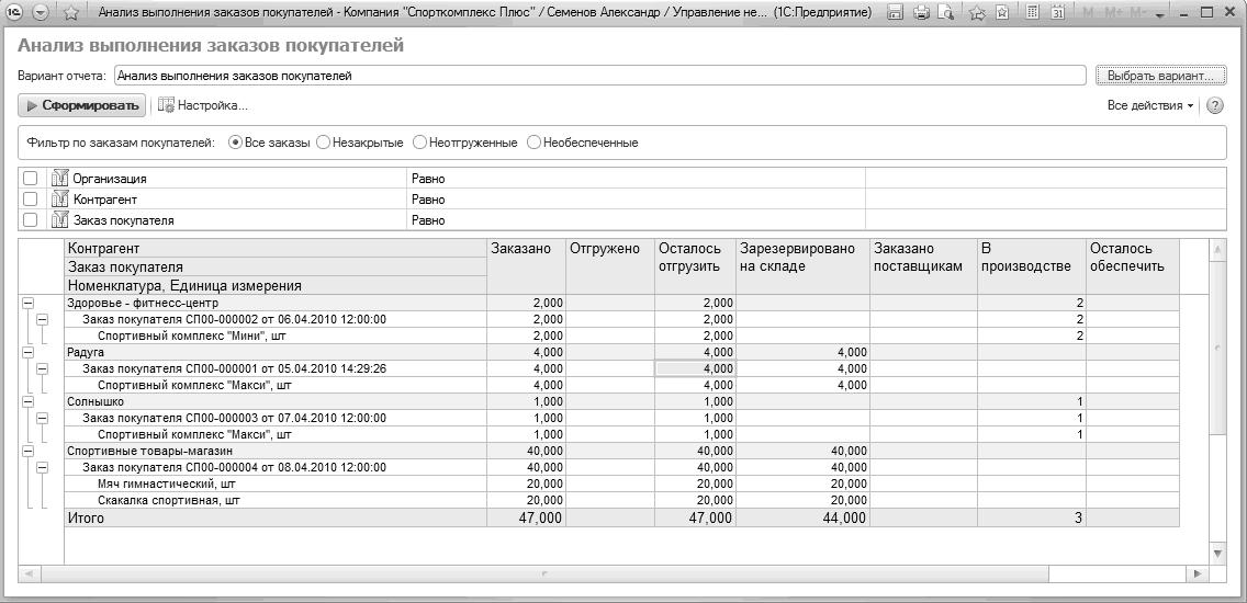 После проведения документа "Заказ покупателя", товары на складе резервируются под данный заказ, что мы сможем увидеть в отчете "Анализ выполнения заказов покупателей" (Рис. 46).