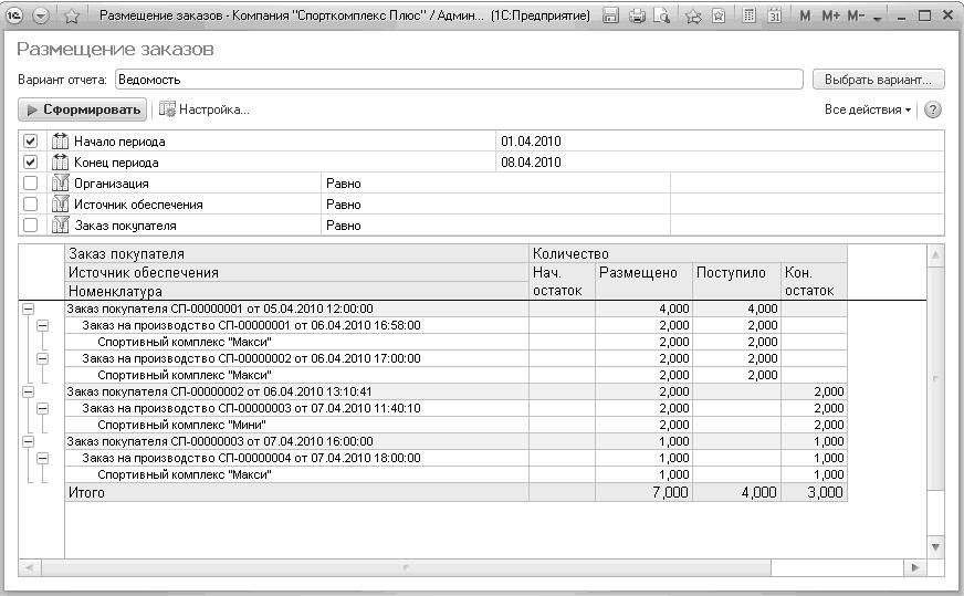 Для проведения контроля того, все ли заказы покупателей попали в план производства, можно сформировать отчет "Анализ выполнения заказов покупателей" из раздела " Продажи" или отчет "Размещение заказов" из раздела "Закупки" (см. Рис. 32и Рис. 33).