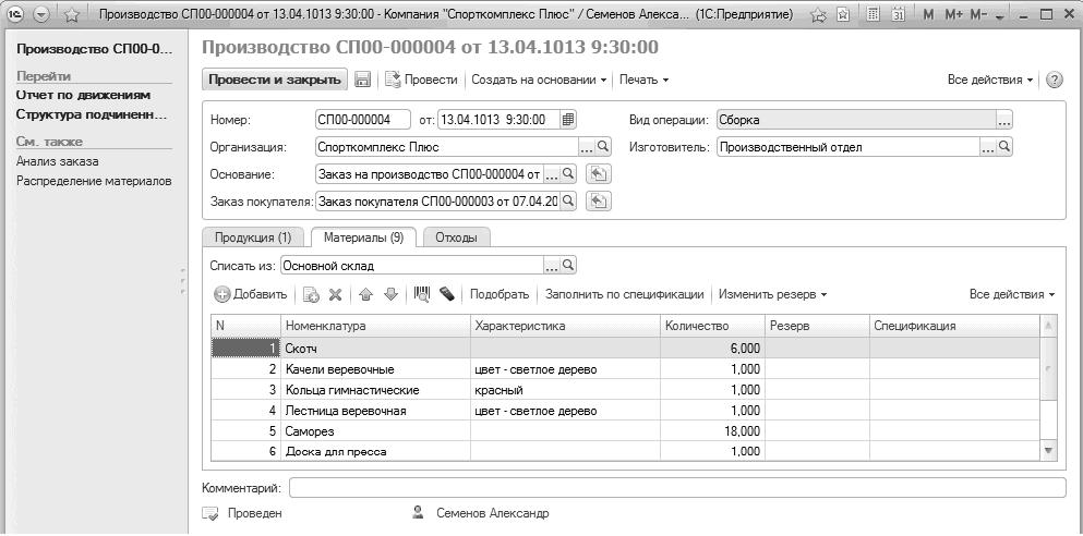 Рис. 35. Документ "Производство". Вкладка "Материалы"