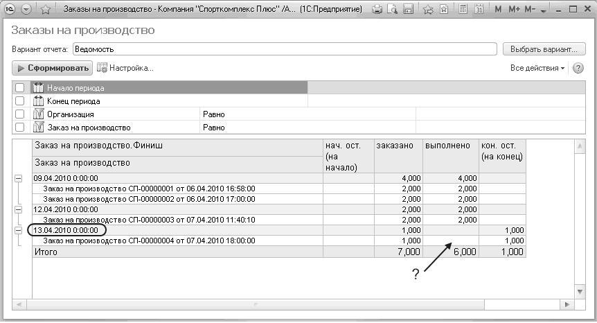 Конечно, чтобы получить отчет именно такой формы, мы немного "вмешались" в настройку отчета – добавили группировку по <Заказ на производство. Финиш> (см. Рис. 38).