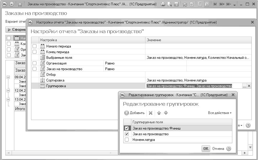 Рис. 38. Настройка группировки в отчете "Заказы на производство"