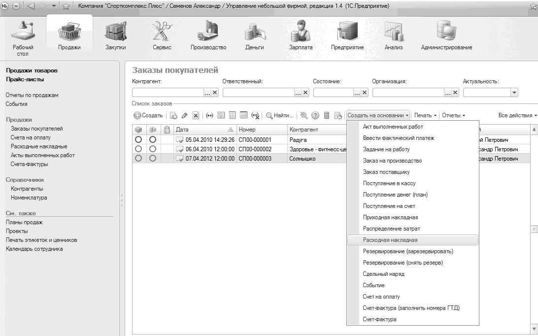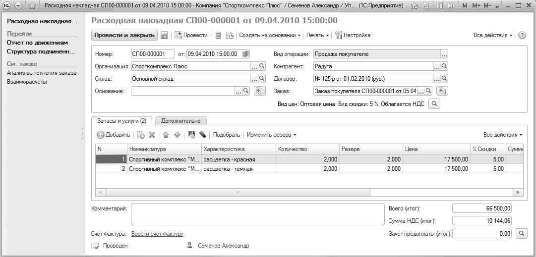 Итак, прояснив вопрос оплаты (переговоры с покупателем регистрируем с помощью документа "Событие"), приступаем к отгрузке товаров, зарезервированных ранее на складе. В программе отгрузка товаров выполняется абсолютно аналогично тому, как мы выполняли ранее отгрузку продукции. Вводим документ "Расходная накладная" на основании "Заказа покупателя", заполняем недостающие реквизиты, печатаем необходимые формы и проводим документ. После чего оформляем счет-фактуру.