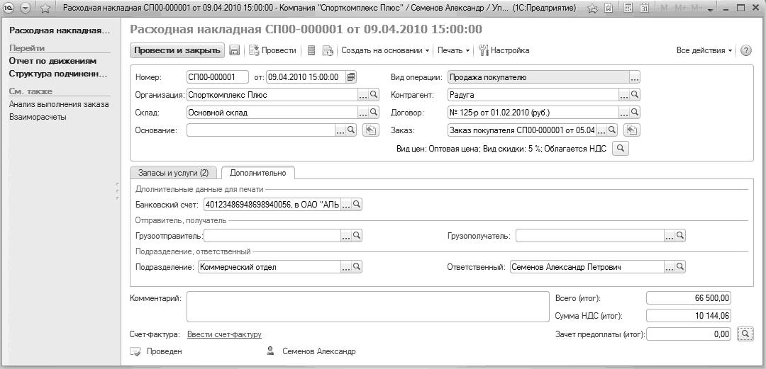 Рис. 41. Документ "Расходная накладная". Вкладка "Дополнительно"