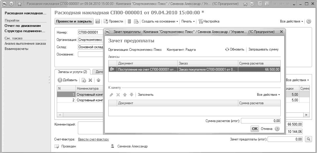 Также существует возможность автоматического зачета аванса (программа сама определит наличия аванса и зачтет его при проведении расходной накладной).