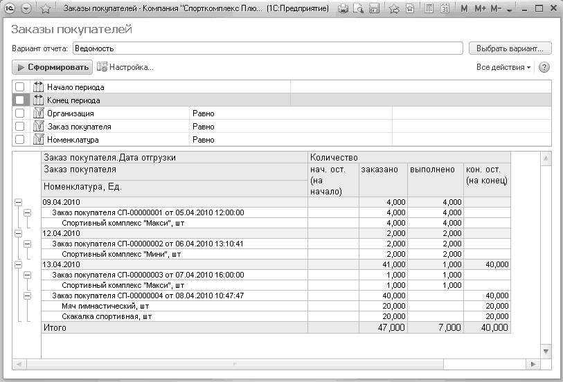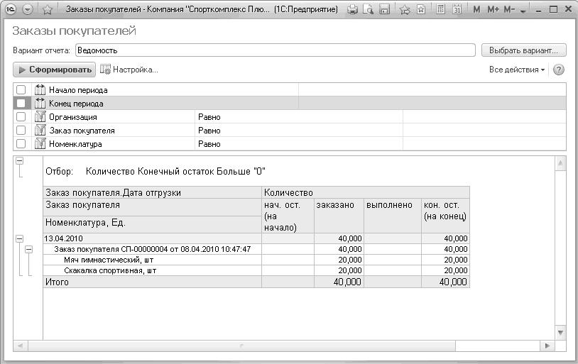 Рис. 49. Отчет "Заказы покупателей" с установленным отбором по конечному остатку