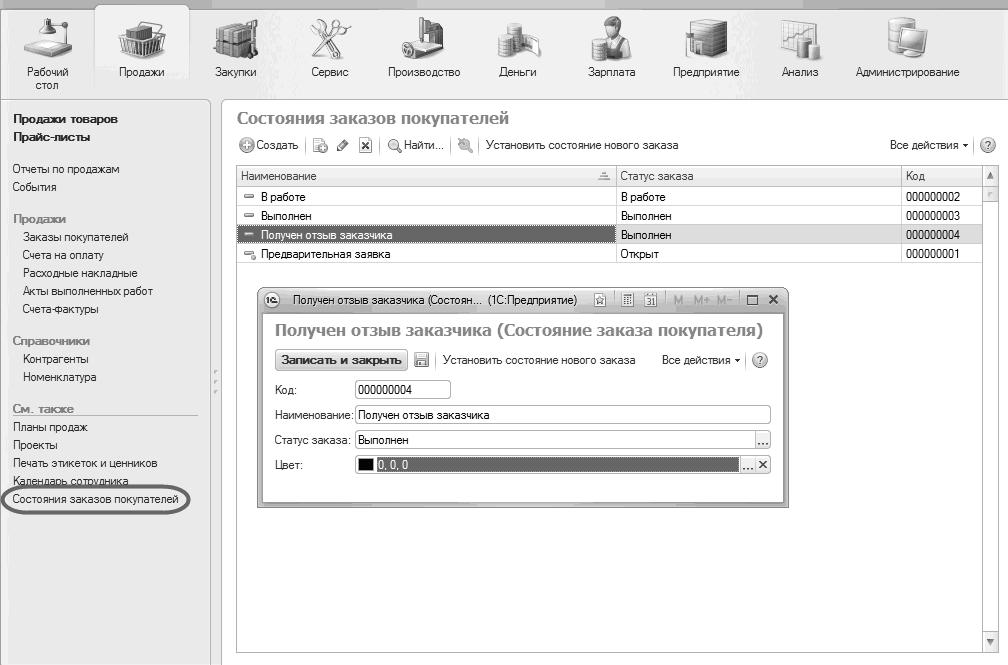 "Состояние", флажок "Закрыт". Смысл с этих реквизитов аналогичен смыслу реквизитов "Состояние" и "Закрыт" в заказах покупателей (что было рассмотрено ранее). Перечень состояний заказов на производство определяется в справочнике "Состояния заказов на производство", доступного на панели навигации в группе "См. также" в разделе "Производство".