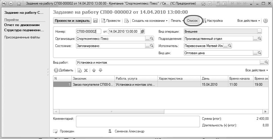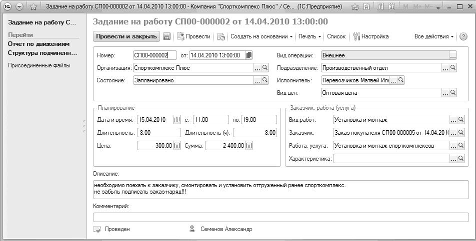 Итак, заказ наряд прошел предварительную обработку и отправился на исполнение. Необходимо выдать задание исполнителям. Введем документ "Задание на работу" (Рис. 55).