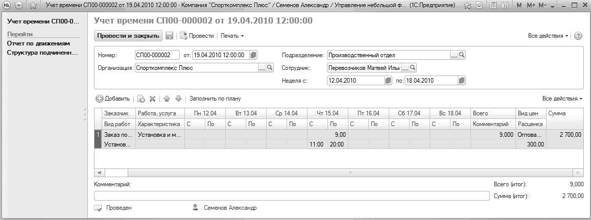 Факт выполнения работы исполнителем регистрируется с помощью документа "Учет времени" (Рис. 57), доступного в разделе "Работы, услуги, производство".