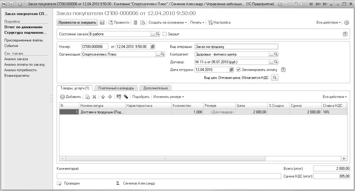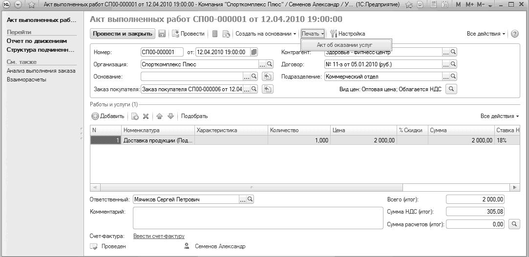Теперь проводим документ "Заказ-наряд" и отражаем состоявшуюся продажу (факт приема работ заказчиком). Все, на этом цепочка завершена.