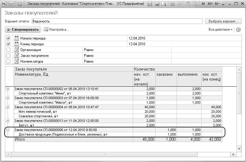 Сформировав отчет, смотрим на календарь. Если 13 число (плановая дата отгрузки по заказу № СП-000000004) еще не наступило, то ситуация нормальная, а если 13 апреля уже прошло, а в графе "Выполнено" напротив заказа № СП-000000004 до сих пор пусто, значит мы не выполнили отгрузку в срок. Самое время пригласить ответственного сотрудника (реквизит "Ответственный" на вкладке "Дополнительно" в документе "Заказ покупателя") и выяснить, почему так случилось. Возможно, покупатель не произвел предусмотренную условиями сделки предварительную оплату. Может быть, мы ему счет забыли выставить?