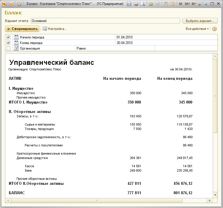 Напомним, что для получения управленческого баланса в программе мы не предпринимали никаких специальных действий, а просто отражали хозяйственные операции предназначенными для этих операций документами. Это обстоятельство делает возможным получить управленческий баланс в программе автоматически, даже если в числе сотрудников небольшой фирмы нет специалистов с глубоким пониманием принципов организации управленческого учета.