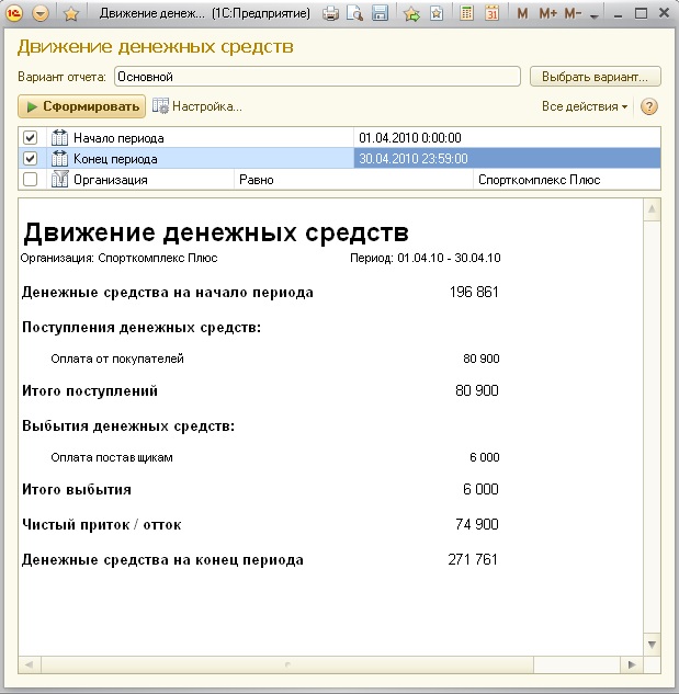 Отчет показывает остатки денежных средств на начало и на конец периода, поступления и выбытия денежных средств – постатейно, а также – чистый приток/отток денежных средств, рассчитываемый как разница между суммой поступлений и суммой выбытий.