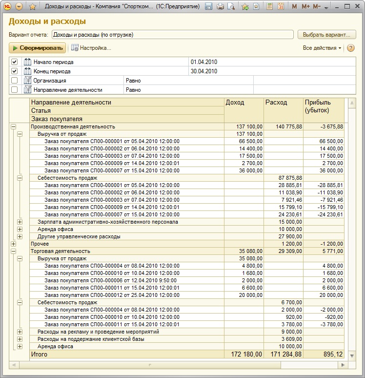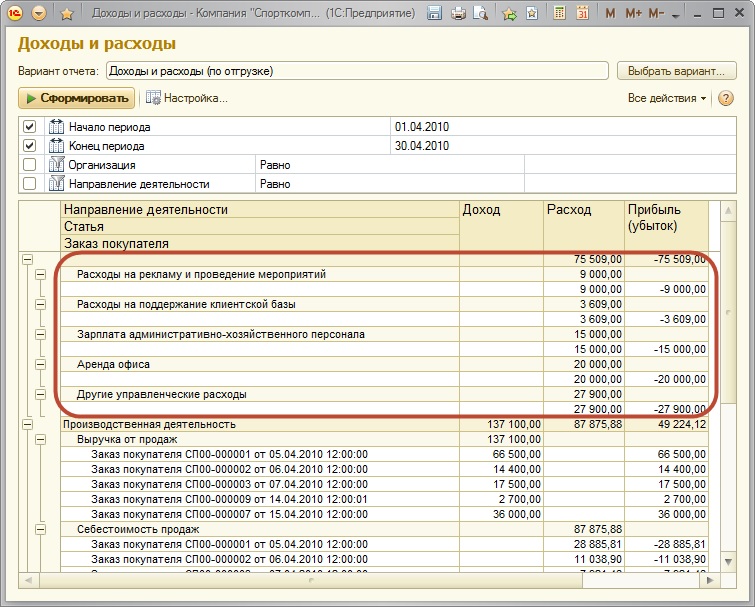 Рис. 194. Отчет "Доходы и расходы", по видам деятельности и статьям