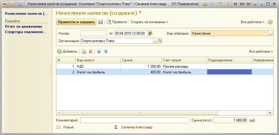 Это – сумма НДС, введенная документом "Начисление налогов". Как мы уже отмечали ранее, программа "1С:Управление небольшой фирмой 8" не ведет расчет налогов (расчет налогов является задачей бухгалтерской и потому ведется в программе "1С:Бухгалтерия 8" или другой бухгалтерской программе), однако рассчитанные в бухгалтерии налоги мы должны отразить в качестве расходов по управленческому учету. На Рис. 196 показан документ "Начисление налогов", с помощью которого это делается. Он доступен на панели навигации раздела "Предприятие" в группе "Финансовые операции".