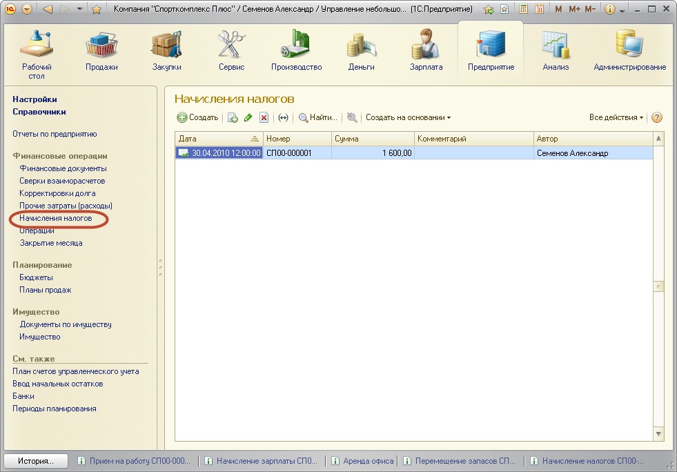 Рис. 197. Документы "Начисление налогов" в разделе "Предприятие"