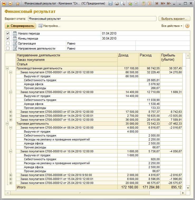 отчет "Финансовый результат" - для анализа финансового результата в разрезе заказов покупателей и видов деятельности, с учетом всех расходов;