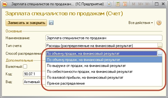 Отчет примечателен тем, что в нем все суммы расходов распределены по заказам покупателей. При этом расходы, не относящиеся на себестоимость продаж - включая управленческие, коммерческие и прочие (например, НДС), также распределены по заказам покупателей. Распределение таких расходов происходит в соответствии с выбранным в плане счетов способом распределения (пример показан на Рис. 200). Отчет может быть полезен для проведения сравнительного анализа прибыльности/убыточности отдельных заказов или видов деятельности, с учетом всех затрат предприятия.