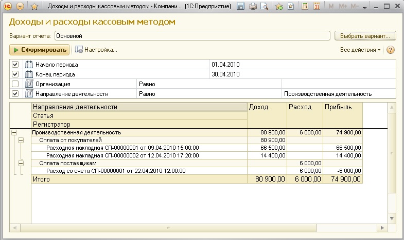 Итак, мы рассмотрели, с помощью каких средств программы можно провести анализ доходов и расходов традиционным методом – методом начисления (по отгрузке).