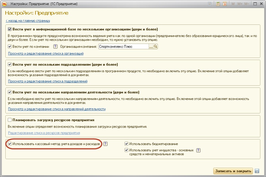 Рис. 203. Установка флажка "Кассовый метод учета доходов и расходов"