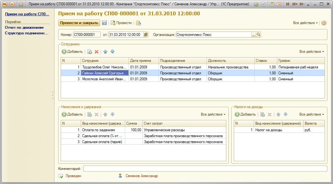 Должность сотрудника, график его работы, количество ставок, система оплаты труда и подразделение, в котором трудится сотрудник, определяются при приеме его на работу (документ "Прием на работу"). В случае, если перечисленные параметры работы сотрудника меняются, то это необходимо отразить в программе с помощью документа "Кадровое перемещение".