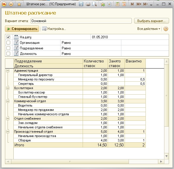 Рис. 218. Информация о занятых и вакантных ставках в отчете "Штатное расписание"