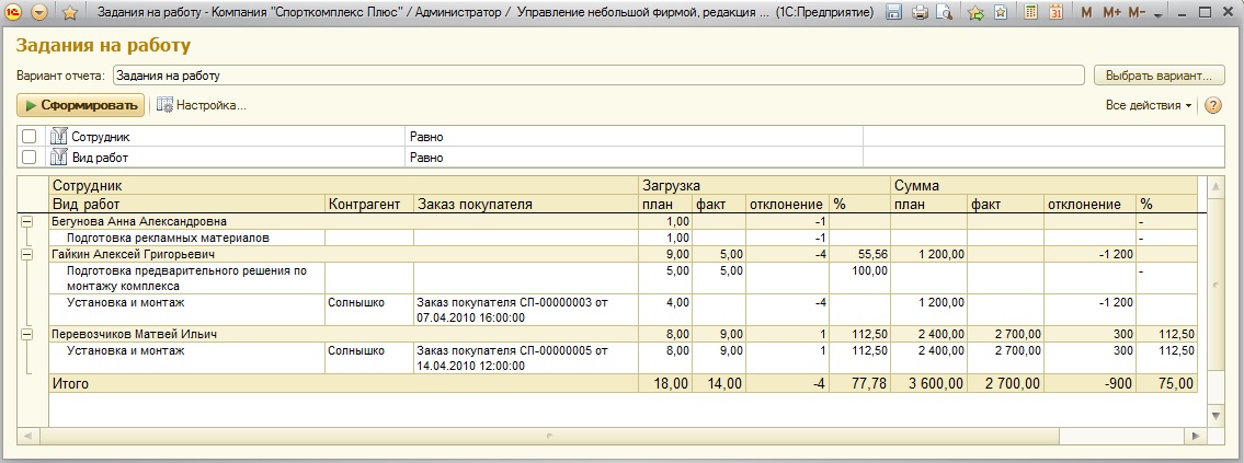 В показанном примере видно, что сотрудник Бегунова еще не предоставила рекламные материалы, а Гайкин не выполнил установку и монтаж по заказу № СП-000000003 клиента Солнышко. Показатели графы "Загрузка" приводятся в отчете в часах. Для внешних заданий присутствуют данные в графе "Сумма", для внутренних – графа "Сумма" пуста.