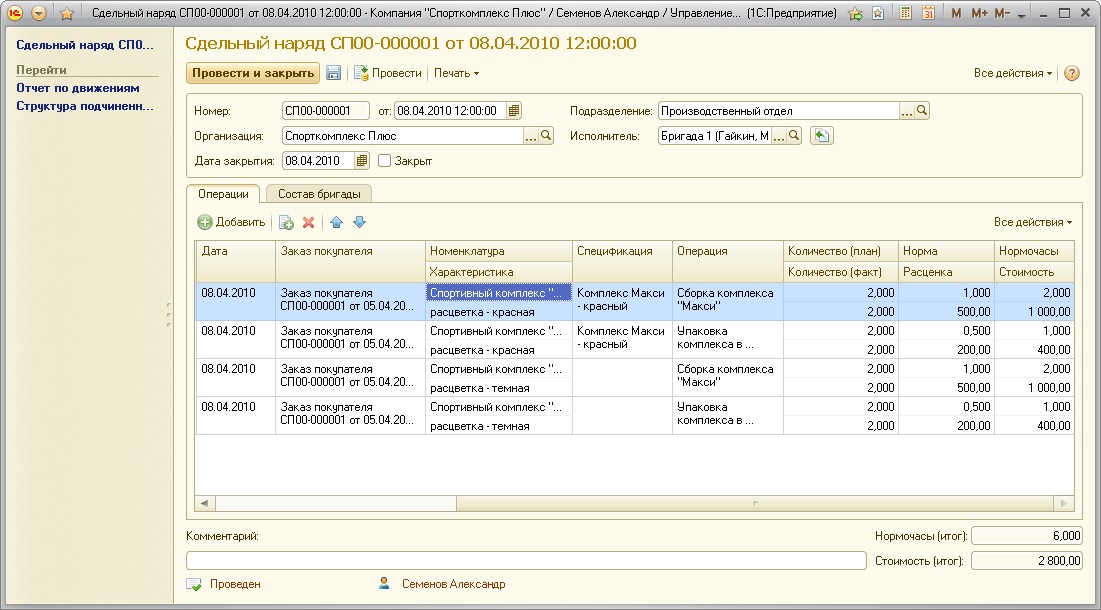 Начислений сдельной зарплаты в программе выполняется документами "Сдельный наряд" и "Заказ-наряд", которые мы уже рассматривали. Напомним, как происходит в них начисление заработной платы.